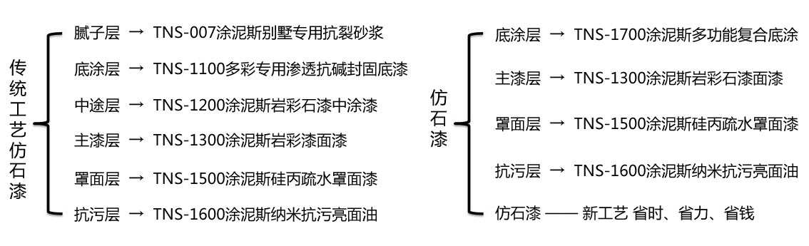 多层次的花岗石涂纹与传统的外墙涂料及拼贴磁砖之风格迥异,能充分表现天然石材的质感;效果逼真,可选颜色多样。